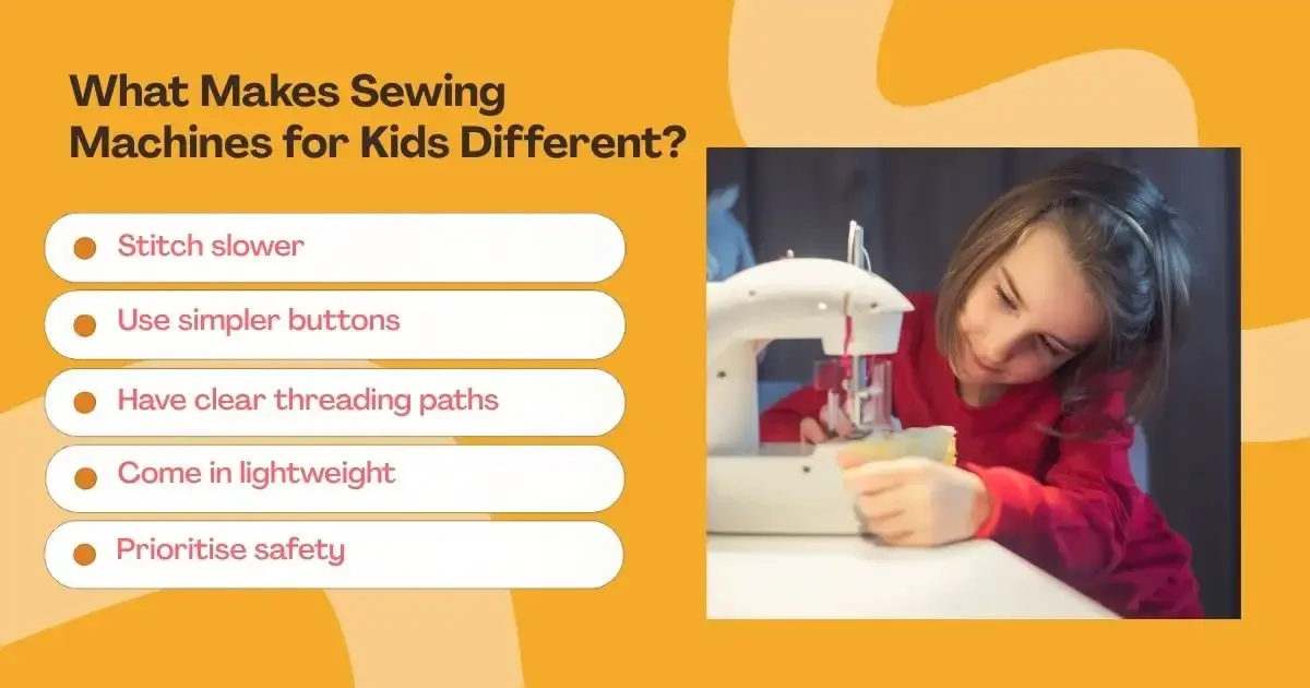 A sewing machine for kids is designed with slower stitching speeds, simplified controls, and added safety features to help beginners learn without frustration. Kids’ sewing machines aren’t just smaller versions of adult machines. They are intentionally built to: